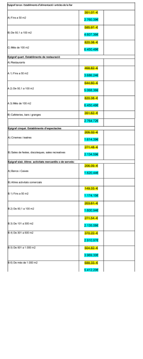 A grans trets, en la proposta que s'ha pogut consultar aquest dijous, el gruix dels augments anava a parar als rebuts de les activitats comercials i les empreses, que es multiplicaven per vuit, amb diferències de milers d'euros entre la taxa actual i la prevista a partir del 2025.