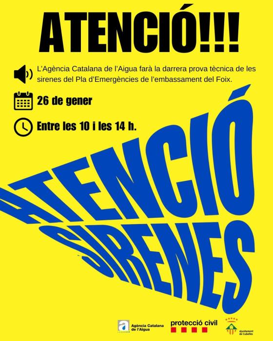 L’Agència Catalana de l’Aigua, Protecció Civil de la Generalitat i l’Ajuntament han informat d’una última prova de les sirenes del pla d’emergència de l’embassament del Foix. L’horari previst és de les deu del matí a les dues del migdia d’aquest dilluns 26 de gener i, en principi, només s’activarà la torre acústica més llunyana, la situada a la presa de l’embassament. Les altres quatre sirenes ubicades per Cubelles no es preveu que sonin en cap moment.