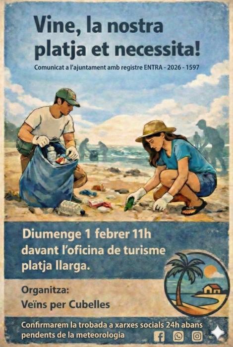 L'associació Veïns per Cubelles, nascuda aquest 2025 passat, ha convocat per aquest diumenge una neteja popular de les platges de la vila. La trobada està prevista per aquest diumenge 1 de febrer a partir de les 11 del matí al punt d'informació turística del passeig Marítim, a la platja Llarga. La intenció de l'entitat és donar suport a altres grups locals que habitualment ja queden periòdicament per fer aquesta tasca voluntària. En cas que hi hagi cap canvi en l'activitat, l'associació informarà pels seus canals a les xarxes socials.