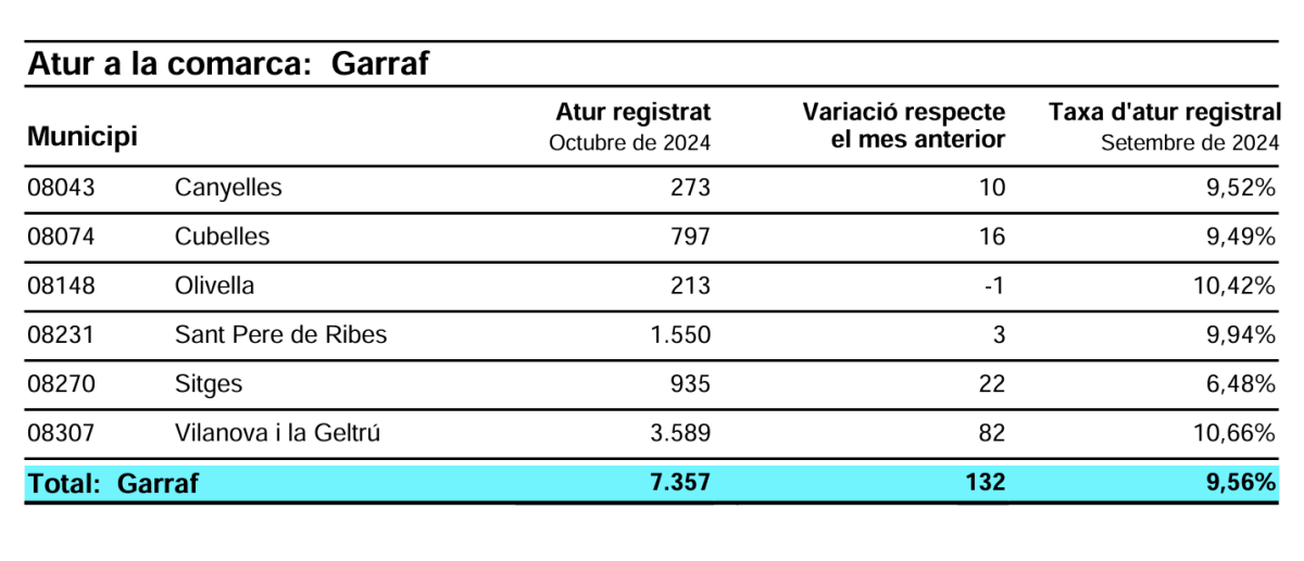 A tot al Garraf també s’ha incrementat l’atur, concretament en 132 persones. El total de la comarca creix fins a 7.360 persones aproximadament. El nombre d’aturats ha augmentat a tots els municipis excepte a Olivella. Proporcionalment, els augments de Canyelles i Cubelles són els més destacats.