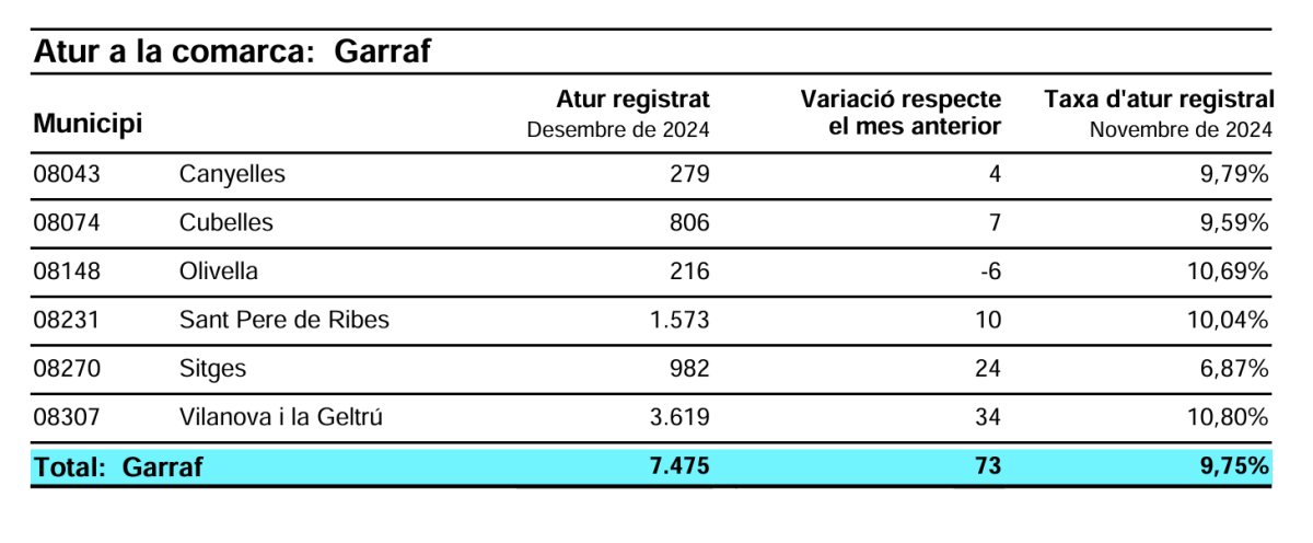 Al conjunt del Garraf, l’atur registrat també ha repuntat en una setantena de persones i s’acosta als 7.500 aturats. En tots els municipis s’ha viscut aquest increment amb l’única excepció d’Olivella.