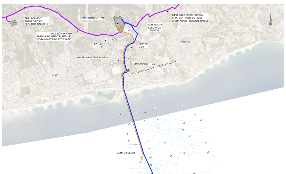 La planta dessalinitzadora anirà ubicada als antics dipòsits de fuel de la Tèrmica, al costat de la subestació elèctrica del Foix, al damunt de l'autopista. La infraestructura també comptarà amb les canonades d'emissió i les de captació, que travessaran el municipi per arribar al mar, i una zona de bombament a tocar de la via del tren, a prop dels terrenys de l'antiga central.