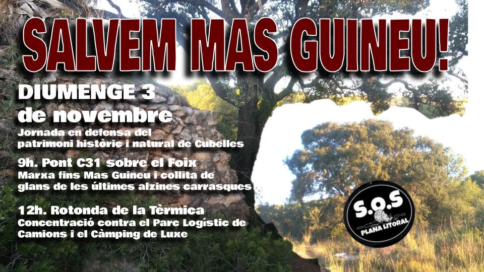 Sota el nom 'Salvem Mas Guineu' la plataforma SOS Plana Litoral, formada per APMA Garraf, Arba Litoral, GEVEN i Actiu art, ha organitzat una jornada en defensa del patrimoni històric i natural de Cubelles. L'activitat tindrà lloc el diumenge 3 de novembre amb una marxa que començarà a les 9 h. des del pont de la C31 sobre el riu Foix fins a Mas Guineu on tindrà lloc una collita de glans. A les 12 h. es farà una concentració contra el futur "Parc logístic de camions i el càmping de luxe". Oriol Millán, president d'Arba Litoral Cubelles ho ha explicat d'aquesta manera durant una entrevista a Ràdio Cubelles.