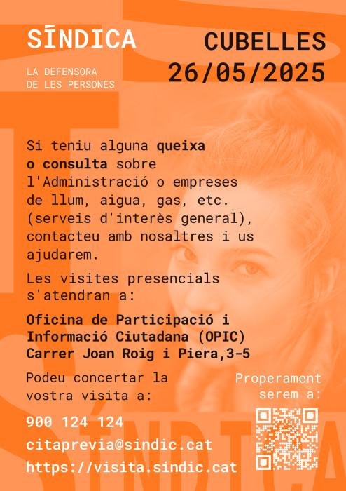El 26 de maig l’equip de la síndica farà una atenció presencial o telemàtica (trucada o videotrucada) dirigida als veïns i a les entitats de Cubelles que vulguin fer consultes o exposar queixes en relació amb vulneracions dels seus drets per part d’administracions públiques i empreses que presten serveis generals (aigua, llum, gas,...).
