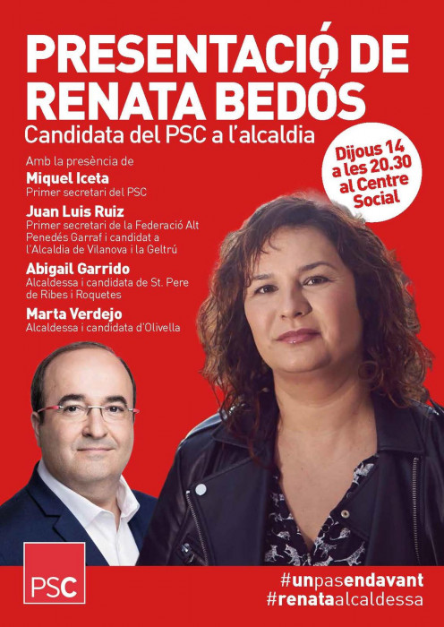 El PSC de Cubelles ja té a punt al presentació de la seva cap de llista, Renata Bedós. L'acte es farà aquest dijous a les 20.30 al Centre Social i comptarà amb el primer secretari del PSC, Miquel Iceta, l'alcladessa i candidata socialista de Sant Pere de Ribes, Abigail Garrido, i l'alcaldessa d'Olivella i també cap de llista del PSC, Marta Verdejo.