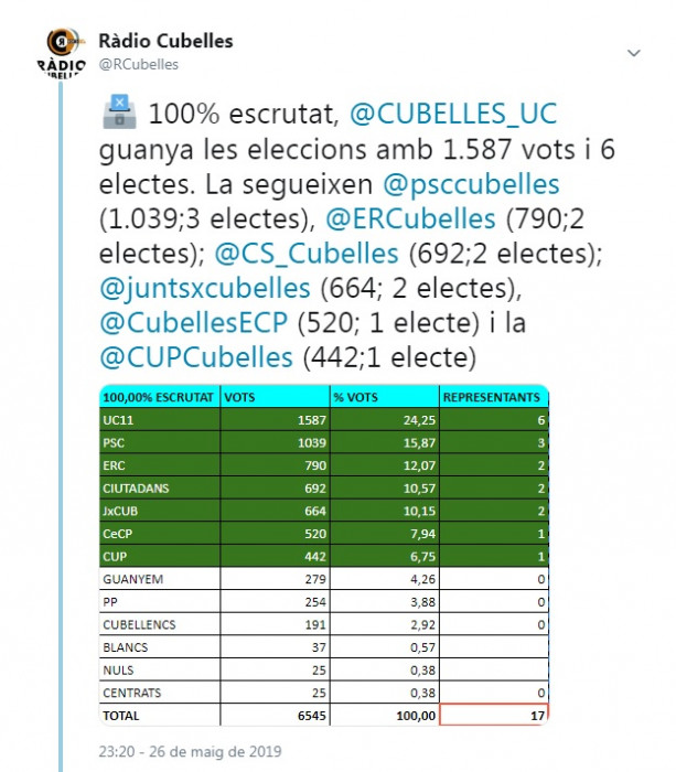 Unitat Cubellenca (UC) ha guanyat les eleccions municipals celebrades aquest diumenge, 26 de maig a Cubelles. Amb 1.587 vots, el partit liderat per l'actual alcaldessa Rosa Fonoll aconsegueix 456 vots més que ara fa quatre anys. Amplia els seus electes de 4 a 6 regidors al nou Plenari. La cap de llista d'UC, Rosa Fonoll ha manifestat estar en disposició de reeditar el pacte de Govern que mantenien amb ERC, que manté els dos representants; i Cubelles en Comú Podem (CeCP), que hereda l'espai d'ICV i el regidor d'aquesta formació.