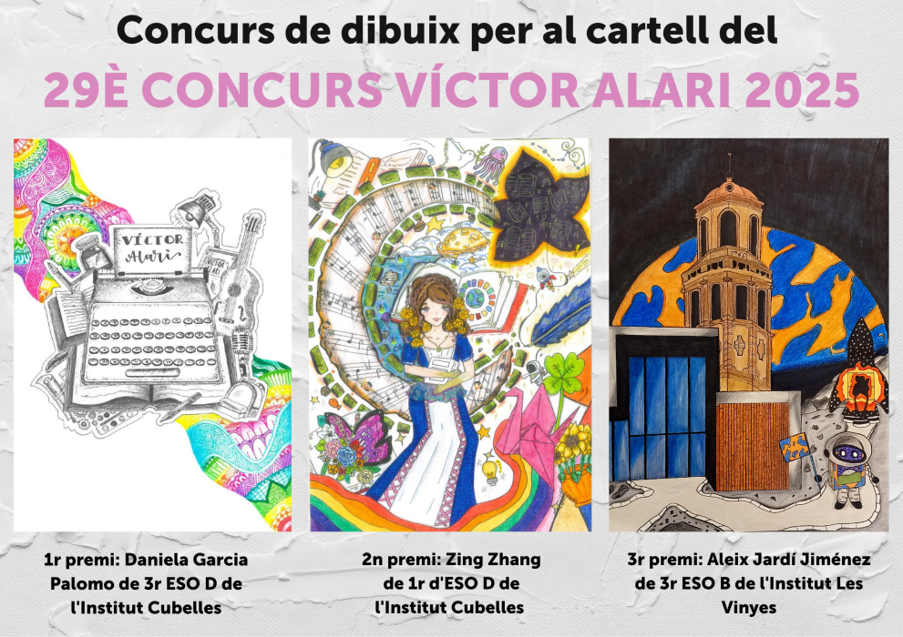 Daniela Garcia de 3r D de l'Institut Cubelles s'endú el primer premi del concurs per al cartell dels premis Víctor Alari 2025. Zing zhang de 1r D ESO de l’institut Cubelles, el segon. I l'Aleix Jardí Jiménez de 3r ESO B de l’Institut Les Vinyes de Cubelles s'endú la tercera posició