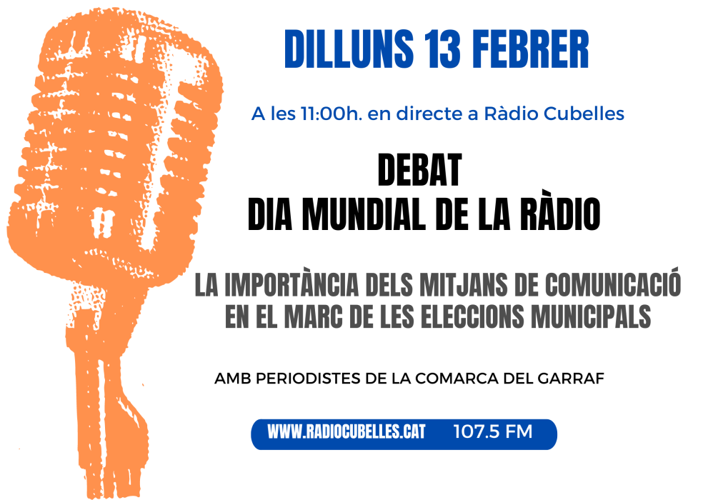 Ràdio Cubelles oferirà aquest dilluns 13 de febrer a partir de les 11:00 h. un debat dedicat al Dia Mundial de la Ràdio. El tema serà 'La importància dels mitjans de comunicació en el marc de les eleccions municipals. Durant el programa periodistes de la comarca del Garraf intercanviaran experiències i idees al voltant del món de la ràdio i del periodisme. Entre d'altres qüestions es posarà sobre la taula: Com estan els mitjans de comunicació a la comarca? I quina és la situació de la Ràdio en el Dia Mundial d'aquest mitjà. Al programa, que serà conduït per la directora de Ràdio Cubelles Àngels Fuster, hi prendran part: Jordi Lleó Periodista freelance, fotògraf, creador de continguts i comunicador; Joan Ignasi Gómez Periodista i costumista i nou gerent de Canal Blau i Ana Ballesteros, periodista de la FURA.
