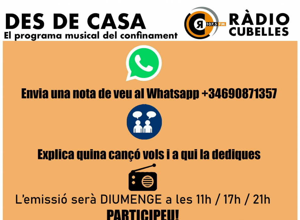 Després de l'èxit amb l'espai de dedicatòries de cançons que va oferir Ràdio Cubelles per l'aniversari, l'emissora seguirà oferint les vostres peticions tot i estar confinats. De fet, hem introduït a la graella de la nostra programació de diumenge, el programa de dedicatòries "Des de casa".