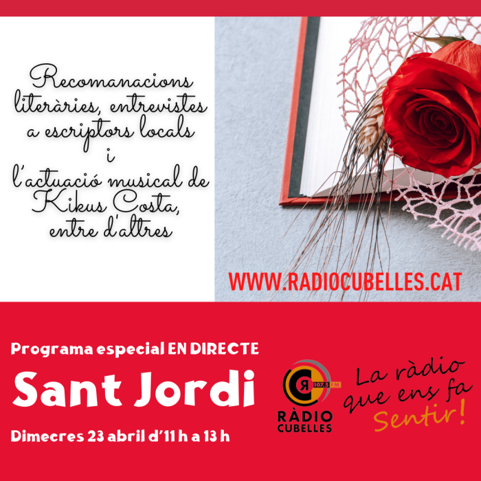 Ràdio Cubelles oferirà el dimecres 23 d'abril un programa especial dedicat a la diada de Sant Jordi. Serà a partir de les 11:00 h. des de la carpa que Ràdio Cubelles tindrà instal·lada a la plaça de la Font. L'especial en directe de dues hores explicarà com s'està desenvolupant la diada a Cubelles i parlarà amb diferents autors locals de les darreres novetats literàries. L'artista cubellenc Kikus Costa serà l'encarregat d'amenitzar el programa i ens aproparà diversos temes musicals del seu repertori. Kikus Costa té una forta vinculació amb Ràdio Cubelles donat que ha estat un dels col·laboradors que ha format part de la història de la ràdio local. Des de l'especial Sant Jordi es demanarà recomanacions literàries als diferents convidats que passin pel programa.