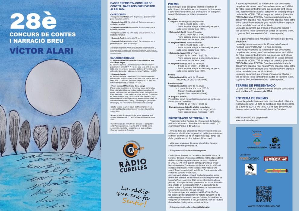 Aquest 2024, en el marc de la celebració del 28è Concurs de contes i Narració Breu Víctor Alari 2024, s’ha convocat el X Concurs per al cartell del certamen. El Concurs s’organitza des dels dos instituts de secundària: Institut Cubelles i Les Vinyes, amb la col·laboració de Ràdio Cubelles i del departament de Comunicació de l’Ajuntament.