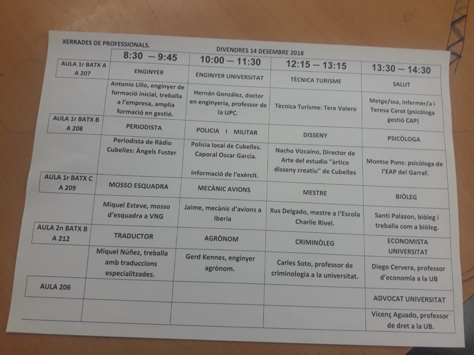 L'alumnat de 4rt, 1r i 2n de Batxillerat ha participat aquest divendres d'una jornada de xerrades professionals organitzades al centre. En total, s'han realitzat 17 xerrades de tipologia diversa, amb professionals del sector de la enginyeria, turisme, salut, psicologia, disseny, periodisme, criminologia, economia, advocacia, mecànica d'avions, mestres, cos policial i mossos, biologia, agronomia, entre d'altres.