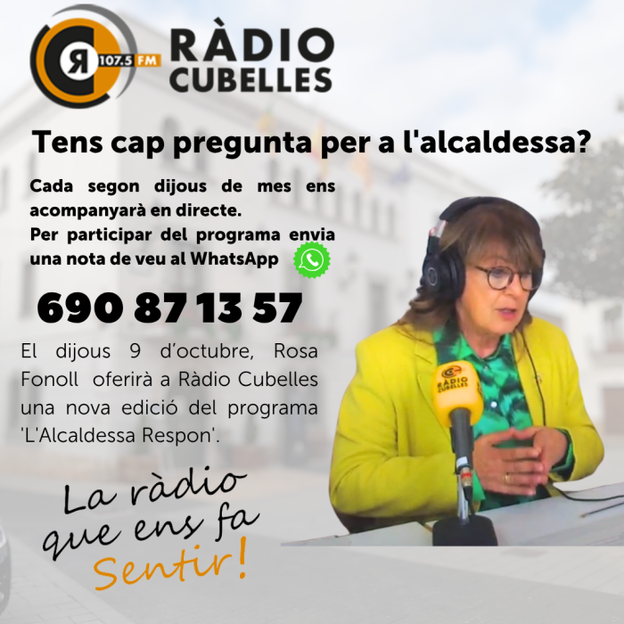 El segon dijous de mes l'alcaldessa de Cubelles, Rosa Fonoll respon a la ciutadania. Les persones que ho vulguin poden formular les seves preguntes mitjançant el whatsapp de l’emissora municipal 690871357