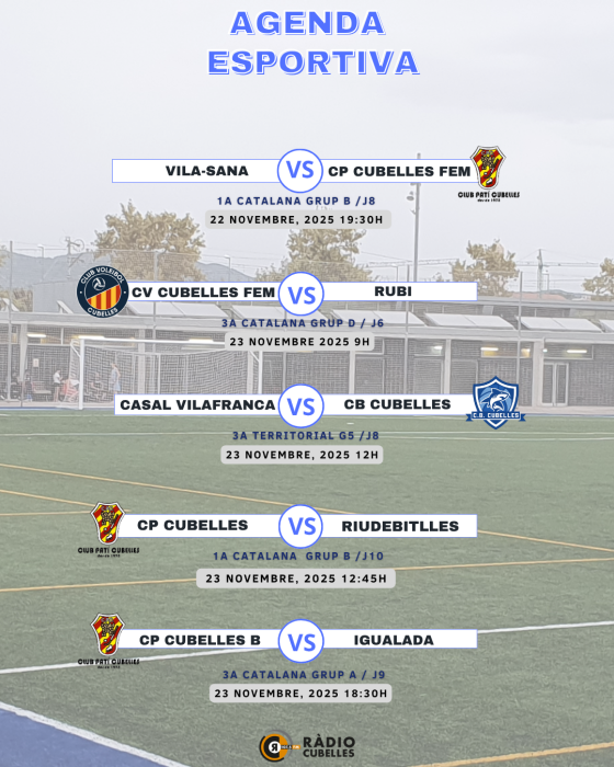 Les entitats esportives de Cubelles encaren un cap de setmana carregat de competició, amb partits repartits entre dissabte 22 i diumenge 23 de novembre de 2025. Futbol, futbol sala, voleibol, bàsquet i hoquei configuren una agenda molt completa per als clubs del municipi.