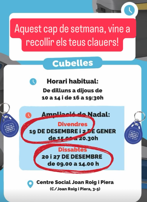 L’Ajuntament de Cubelles adapta temporalment l’horari de l’Oficina de Sensibilització Ambiental amb motiu de les festes de Nadal per facilitar a la ciutadania la recollida dels clauers identificatius i del kit vinculat al nou sistema de gestió de residus. La mesura vol donar resposta especialment a les persones que no poden fer el tràmit entre setmana o que disposen d’una segona residència al municipi. L’ampliació d’horaris posa l’accent en les tardes de divendres i els matins de dissabte, amb la voluntat d’oferir més opcions d’accés al servei en dies no laborables.