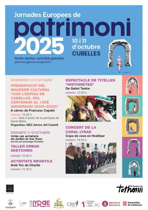 Pel que fa a les Jornades de Patrimoni dels dies 10 i 11 d’octubre, l’edició d’aquest any començarà amb la presentació del quadern cultural Cor l’Espiga de Cubelles. Del centenari al 125è aniversari (2000-2025), a càrrec de Francesc Capdet. L’acte, organitzat per GEC Amics del Castell, tindrà lloc a la sala d’actes de la parròquia de Santa Maria, el divendres 10 d'octubre a les 19 h.