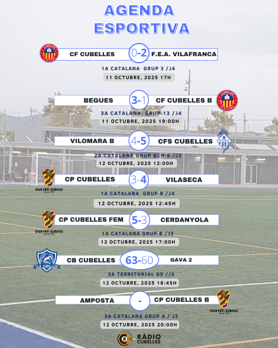 Pel que fa al futbol, els dos equips del CF Cubelles no van poder sumar punts. El primer equip va caure per 0-2 davant el F.E.A. Vilafranca en un partit corresponent a la 1a Catalana (Grup 3, J4). Tot i el suport de l’afició al Josep Pons i Ventura, els visitants van saber aprofitar millor les seves ocasions.
