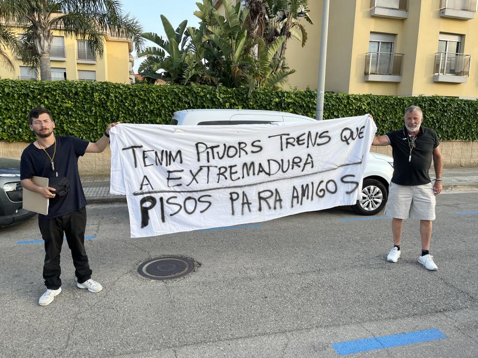 Un altre grup de manifestants, més reduït i de caire més local, ha exhibit pancartes a favor de parcs infantils inclusius per a persones amb mobilitat reduïda, en contra de la situació de Rodalies i posant en dubte l’adjudicació dels pisos.