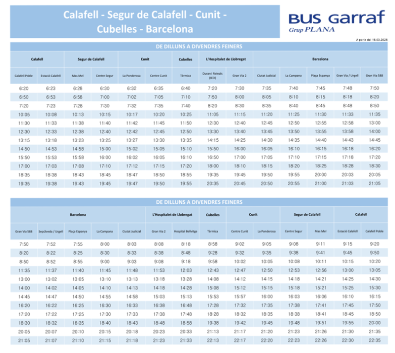 Segons ha publicat la concessionària del transport, la línia 310 que ve de Calafell, a partir de dilluns oferirà 12 viatges d’anada i 12 de tornada, el triple que fins ara. Mentre que en la línia e.15.3 que surt de Cubelles cap a Barcelona amb dues parades a Vilanova, doblarà la primera expedició de les 6.25 i la de les 9.50. Un reforç que ja s’ha posat en marxa aquest dimecres.