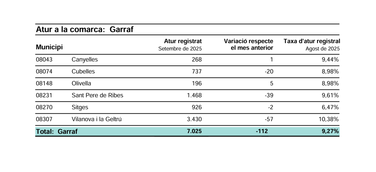 Al conjunt del Garraf també s’ha reduït el nombre de desocupats, que ha queda en 7.025 persones, 112 menys que el mes anterior i 200 menys que el 2024. Excepte Canyelles i Olivella, la resta de municipis de la comarca han registrat descensos en el seu total de desocupats.