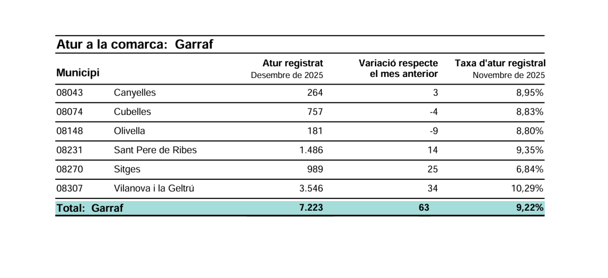 Per municipis, l’atur ha pujat durant el desembre sobretot a Sitges i també a Vilanova, a Sant Pere de Ribes i a Canyelles. En canvi, s’ha reduÏt a Cubelles i a Olivella.