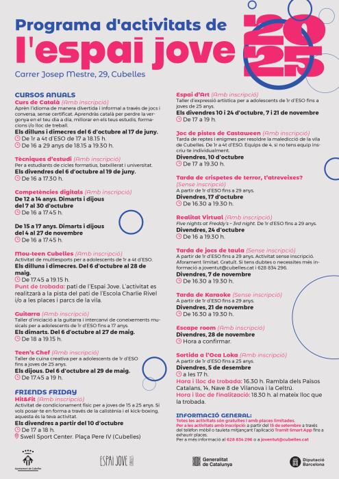 Aquest dilluns 6 d’octubre ha començat la nova proposta de l’equipament juvenil municipal, que inclou activitats pensades per edats des de primer d’ESO fins a universitaris i cicles superiors. Totes les activitats són gratuïtes, però necessiten una inscripció prèvia.