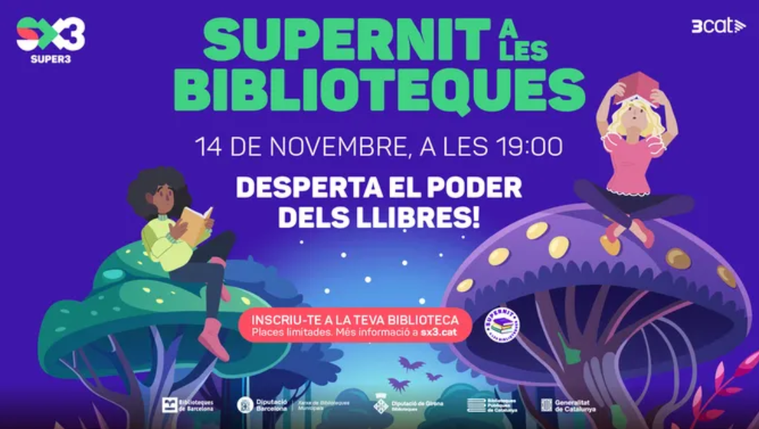 Ja estan obertes les inscripcions per la Supernit a les biblioteques del 14 de novembre. Aquest any, els participants hauran d’ajudar a crear un nou personatge molt especial: “La guardiana de les històries”. Per fer-ho, hauran de treballar en equip i resoldre una sèrie de proves i enigmes inspirats en el món dels llibres: tots els reptes que es proposaran estan relacionats amb el foment de la lectura i l’ús del servei de préstec. Per aconseguir-ho tindran l’ajuda dels presentadors del Ràndom i altres espais de l’SX3.