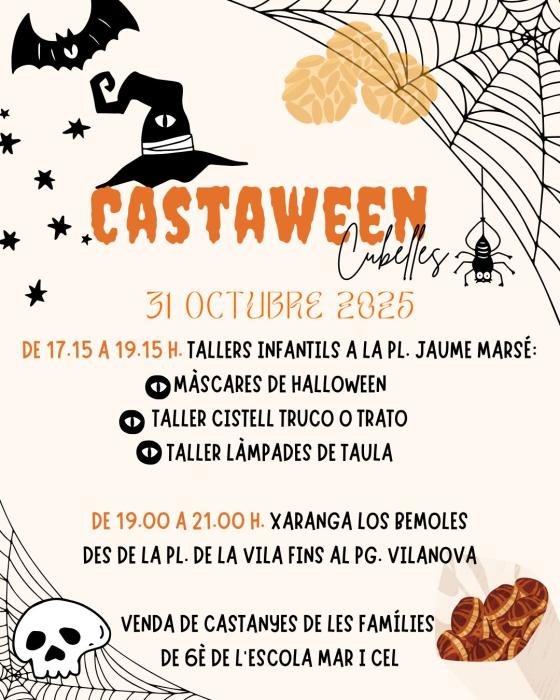 La festa del Castaween de Cubelles arrencarà divendres a les 17.15 i fins a les 19.15 hores, els infants podran participar en els tallers de màscares de Halloween, de cistell truc o crit i làmpades de taula. Hi haurà venda de castanyes amb les famílies de l’alumnat de 6è de primària de l’escola Mar i Cel.