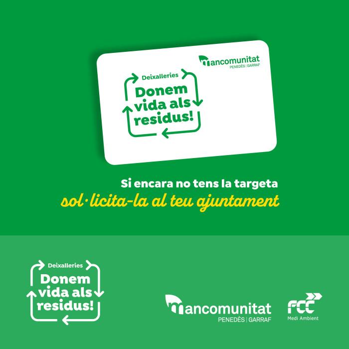 Si encara no es disposa de la targeta es pot sol·licitar a l'ajuntament. Es pot demanar a l’Oficina de Participació i Informació Ciutadana (OPIC), ubicada al Centre Social Joan Roig i Piera, els dimarts i dijous de 9.00 a 13.00 h. En el moment de la sol·licitud, s'ha d'aportar el DNI del titular de la taxa d'escombraries o una autorització (si la persona que ho sol·licita no és titular de la propietat). També es pot trucar al telèfon 93 895 03 00, extensions 1141 i 1151, o enviar un correu electrònic a l’adreça mediambient@cubelles.cat. Caldrà indicar nom i cognoms, DNI i número de telèfon. El personal municipal tramitarà l’alta de la targeta i es posarà en contacte per concertar cita per a la recollida.